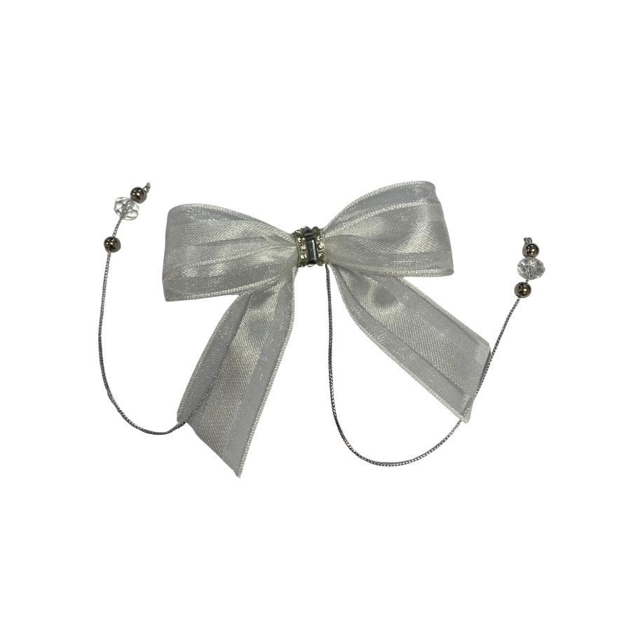 Laço decorativo com pedraria prata, acabamento em cordão metalizado, disponível em três cores e tamanho 8x8cm.