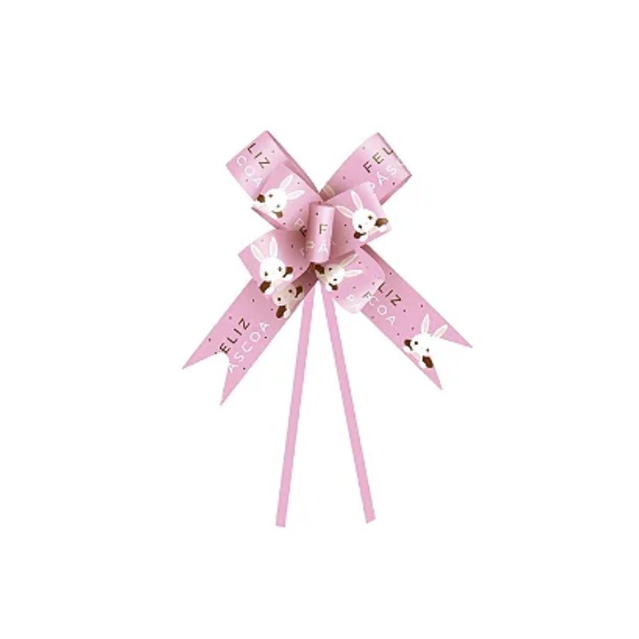 Laço fácil de Páscoa rosa com estampa de coelhinho, ideal para decorar cestas, caixas e lembranças com praticidade e estilo, trazendo charme e delicadeza às suas embalagens temáticas.