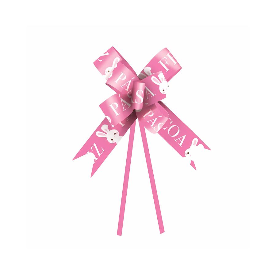 Laço fácil rosa com mensagem de Feliz Páscoa, ideal para decorar embalagens e presentes. Praticidade e elegância em um único detalhe.