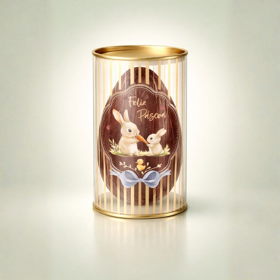 Lata Clean de Páscoa Lovely Garden transparente 9x16,5cm com capacidade aproximada de 250g, ideal para chocolates e kits personalizados. Perfeita para presentes e vendas, com visual elegante e alta valorização do conteúdo.