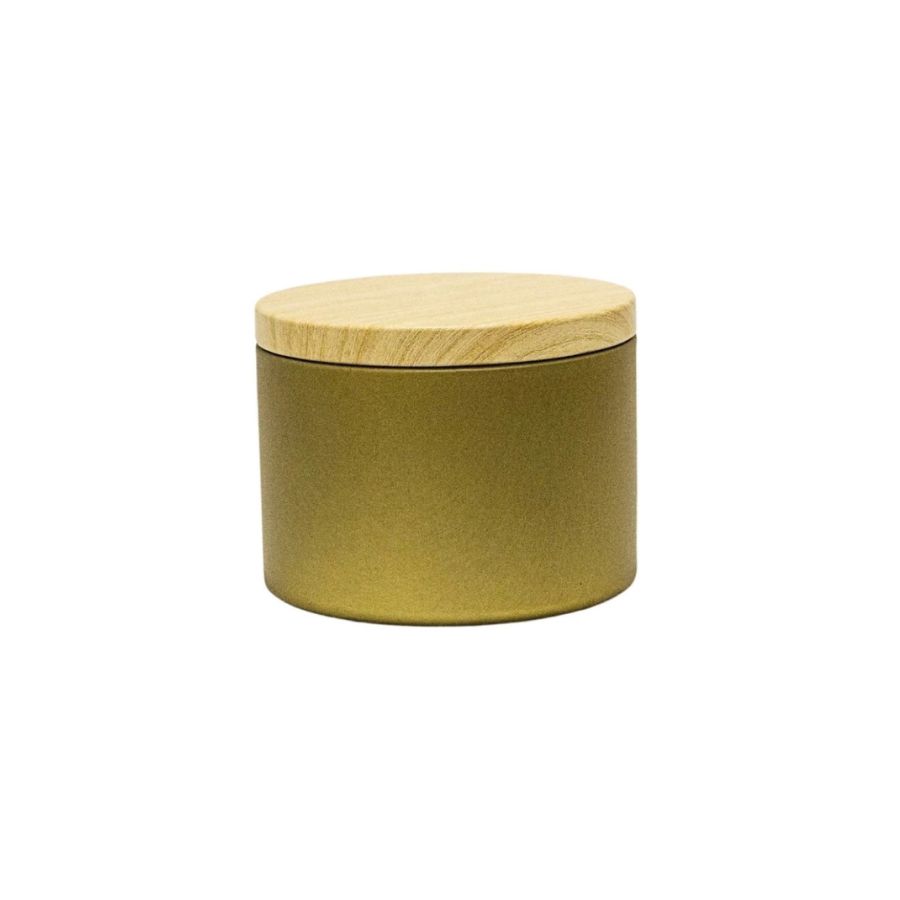 A Lata de Metal com Tampa Estampa Madeira na cor dourada, com capacidade de 240ml e medidas de 8cm de diâmetro por 6cm de altura, é um recipiente metálico versátil, ideal para embalagens diversas, incluindo velas artesanais. Sua robustez e o design com estampa de madeira conferem um toque de elegância e funcionalidade.