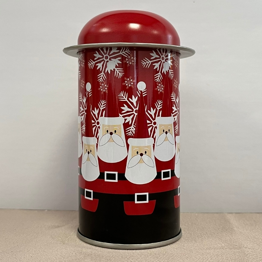 Mini Lata Decorativa de Natal - Mini Papais Noéis - 5,5x11cm, uma peça charmosa e temática, perfeita para decorar ou presentear com o clima natalino.