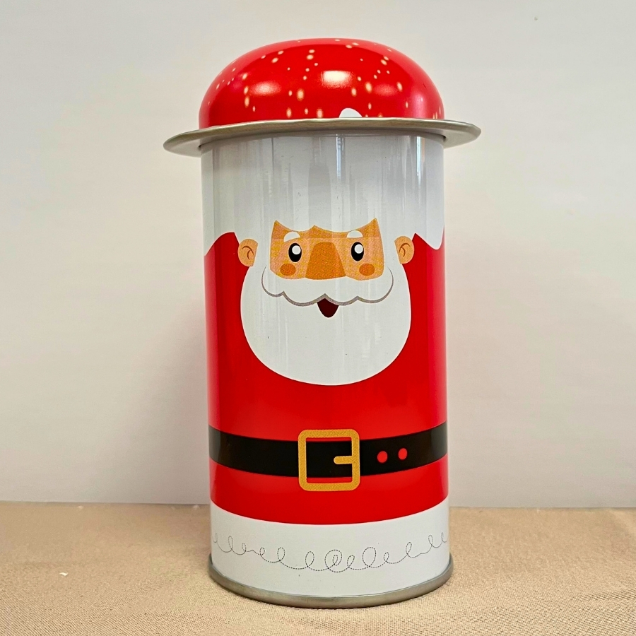 Mini Lata Decorativa de Natal - Papai Noel Feliz - 5,5x11cm, uma peça alegre e temática, ideal para decorar ou presentear com o clima festivo do Natal.