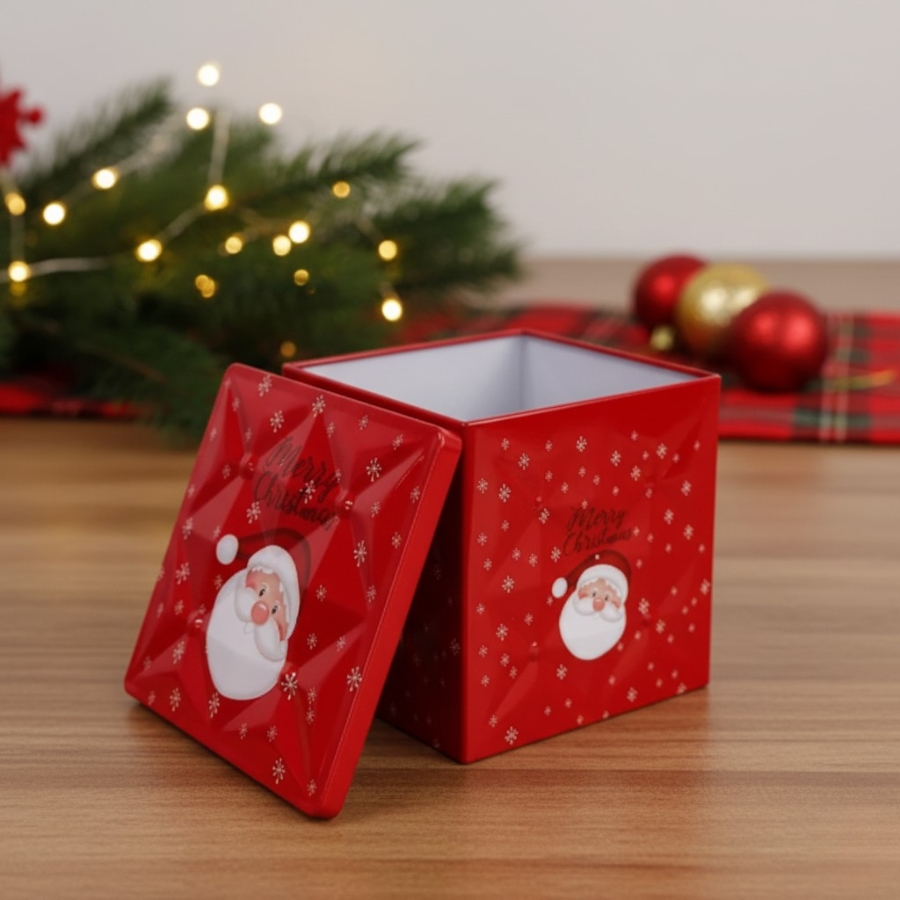 A Lata de Metal de Natal Decorativa 9x9x9cm "Merry Christmas" Papai Noel Vermelha é resistente, prática e estilosa, ideal para presentear ou decorar durante o Natal.