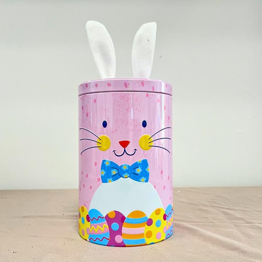 Lata Decorativa Coelinho Lilás - 16x10cm, uma peça fofa e encantadora, perfeita para complementar a decoração de festas e espaços infantis com um toque de charme e alegria.