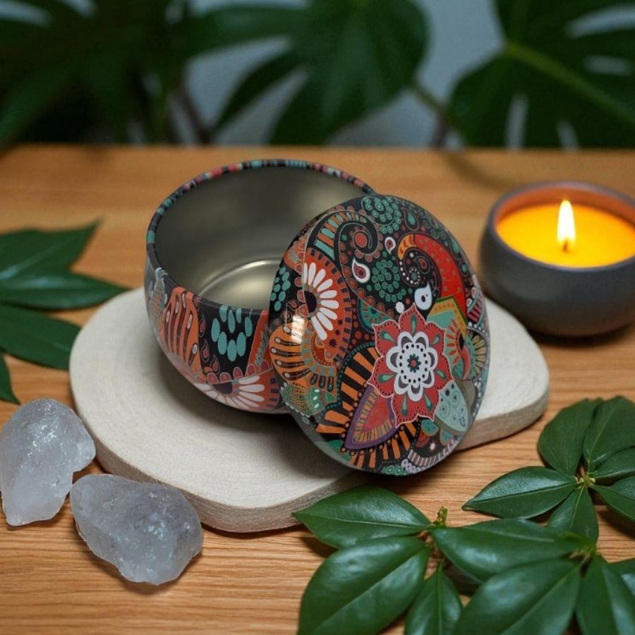 A Lata de Metal Estampa de Mandala é um recipiente compacto e sofisticado, ideal para o mercado de essências, velas e cosméticos artesanais. Com capacidade de 130ml e medidas de 7x7cm, é produzida em metal resistente, garantindo durabilidade e segurança para os produtos. Seu acabamento em mandala preta proporciona um visual moderno e elegante, perfeito para mini velas decorativas, pequenos cosméticos artesanais ou kits aromáticos personalizados.