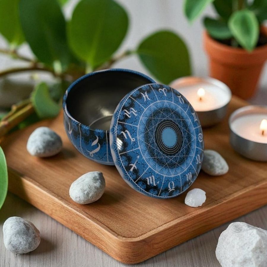 A Lata de Metal Estampa de Signos Azul Claro 6x6cm - 70ml é resistente, prática e decorativa, ideal para mini velas, cosméticos artesanais e kits aromáticos, unindo charme e funcionalidade.