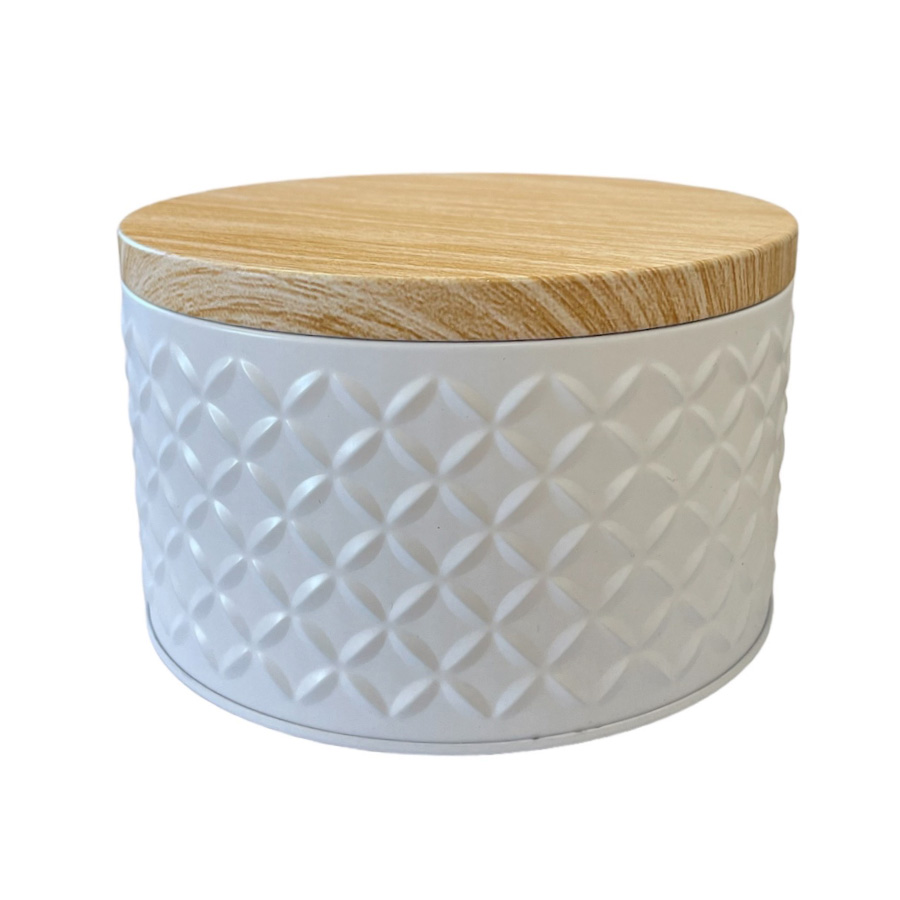 Lata de Metal Redonda Baixa na cor branca, com textura e tampa de metal que imita madeira clara