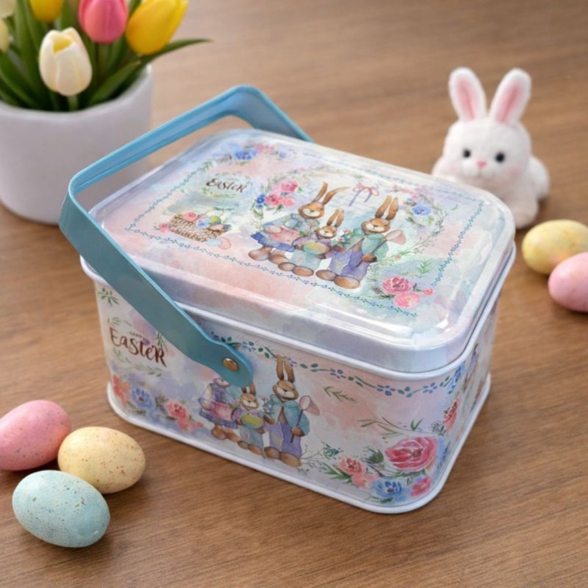 Produzida em metal, a lata possui formato retangular, alça para facilitar o manuseio e estampa temática de Páscoa com família de coelhinhos. Mede aproximadamente 10,5x8x6cm e pode ser utilizada para armazenar pequenos objetos, montar lembrancinhas, kits de Páscoa ou complementar a decoração temática.