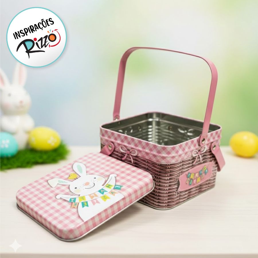 Com dimensões de 15,3x12,7x10,6cm, a lata oferece amplo espaço para bombons, chocolates e pequenos itens, facilitando o transporte e a organização. A alça dupla garante praticidade e segurança, resolvendo a necessidade de quem procura embalagens duráveis, versáteis e visualmente atraentes. Perfeita para uso doméstico, eventos temáticos ou lojas de presentes, ela valoriza o conteúdo e complementa a decoração de Páscoa.