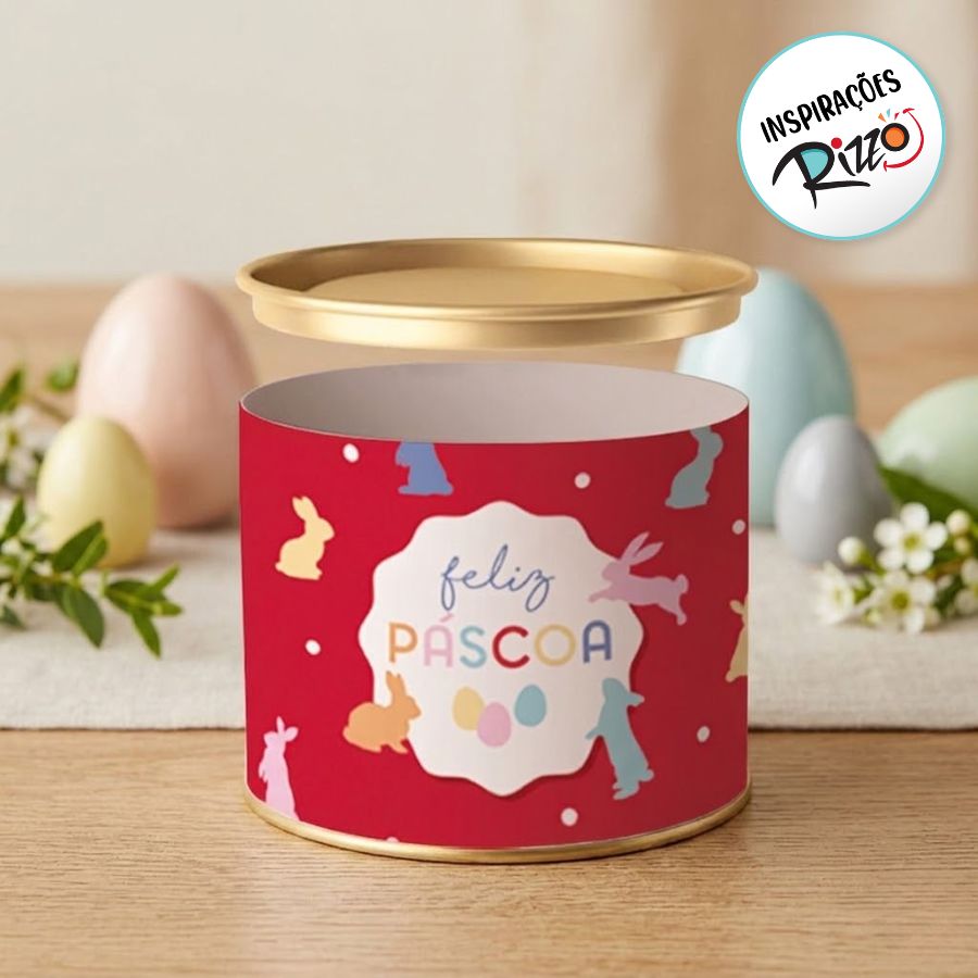 Lata Rígida para doces, com fundo vermelho e coelhinhos coloridos, com escrito Feliz Páscoa colorido.