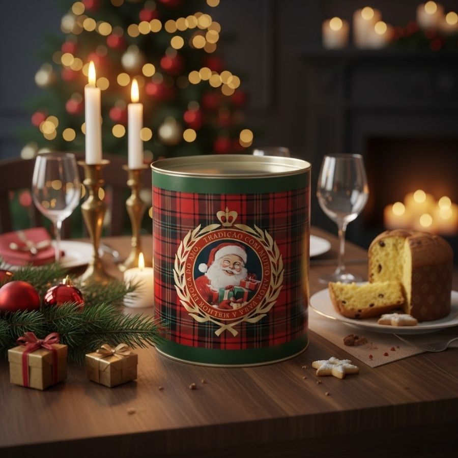 A Lata para Panetone Rígida - Tradição combina elegância e funcionalidade, sendo ideal para panetones de 250g. Produzida em metal resistente, traz uma estampa clássica com elementos natalinos tradicionais, perfeita para quem valoriza o charme e a sofisticação das festas de fim de ano. Seu acabamento refinado e cores festivas transformam o simples ato de presentear em um gesto cheio de significado.