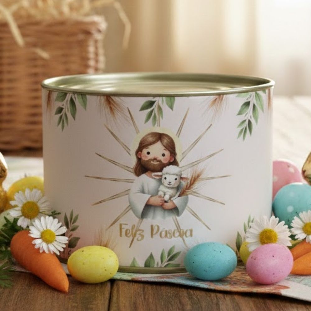 O design traz uma ilustração de Jesus segurando uma ovelhinha, com o texto “Feliz Páscoa” logo abaixo, além de detalhes em folhas que complementam a arte com suavidade. Uma embalagem especial que une significado e beleza para tornar a data ainda mais marcante.