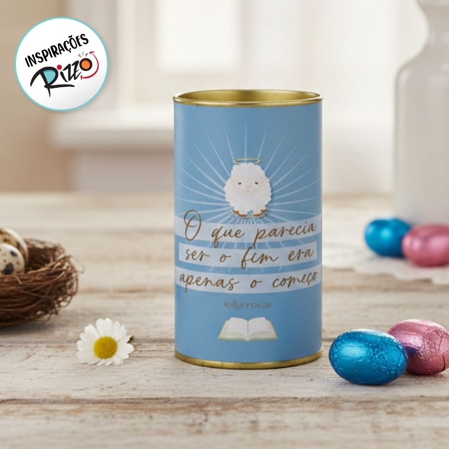 A Lata Rígida para Ovos de 500g modelo Cordeirinho Versículo é uma embalagem encantadora e resistente, ideal para valorizar ovos de chocolate maiores e presentes temáticos. Sua estrutura rígida oferece proteção durante o transporte, enquanto a arte com cordeirinho e versículo transmite delicadeza e significado, perfeita para datas comemorativas e lembranças especiais.