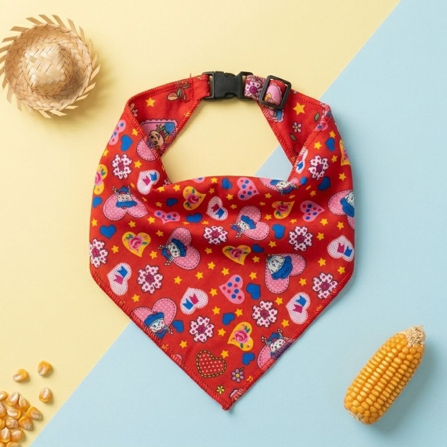 Lenço caipira vermelho com corações, tamanho M, ideal para compor fantasias e acessórios de festas juninas, trazendo charme, carinho e autenticidade.