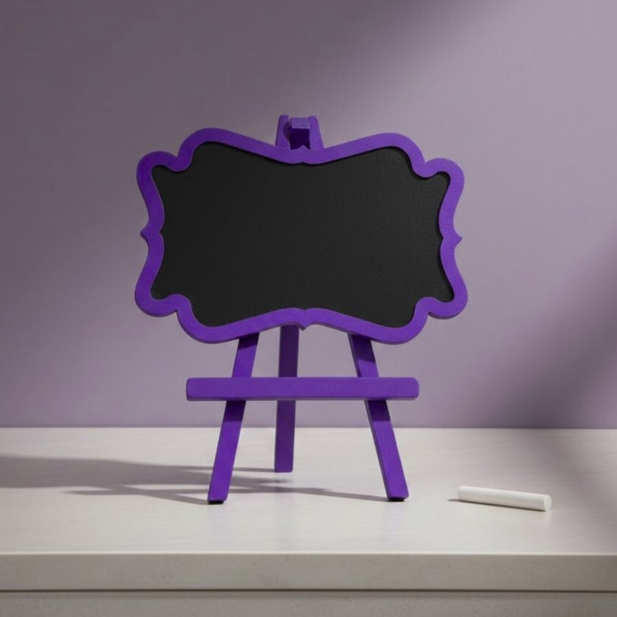 Lousa decorativa em MDF com acabamento em arabesco na cor roxa, ideal para mensagens, sinalização e identificação com visual elegante e criativo. Possui medidas aproximadas de 24x20cm, perfeita para festas e ambientes decorativos.