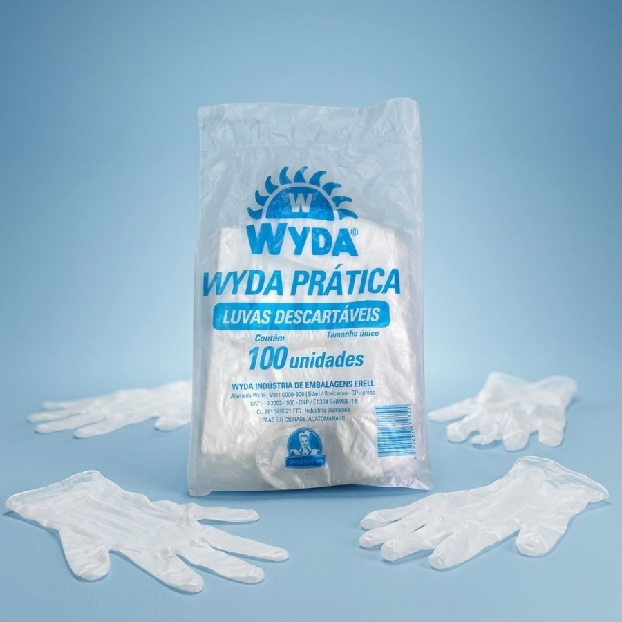 Luva descartável transparente Wyda, tamanho único, resistente e confortável, ideal para uso profissional com higiene e proteção das mãos.