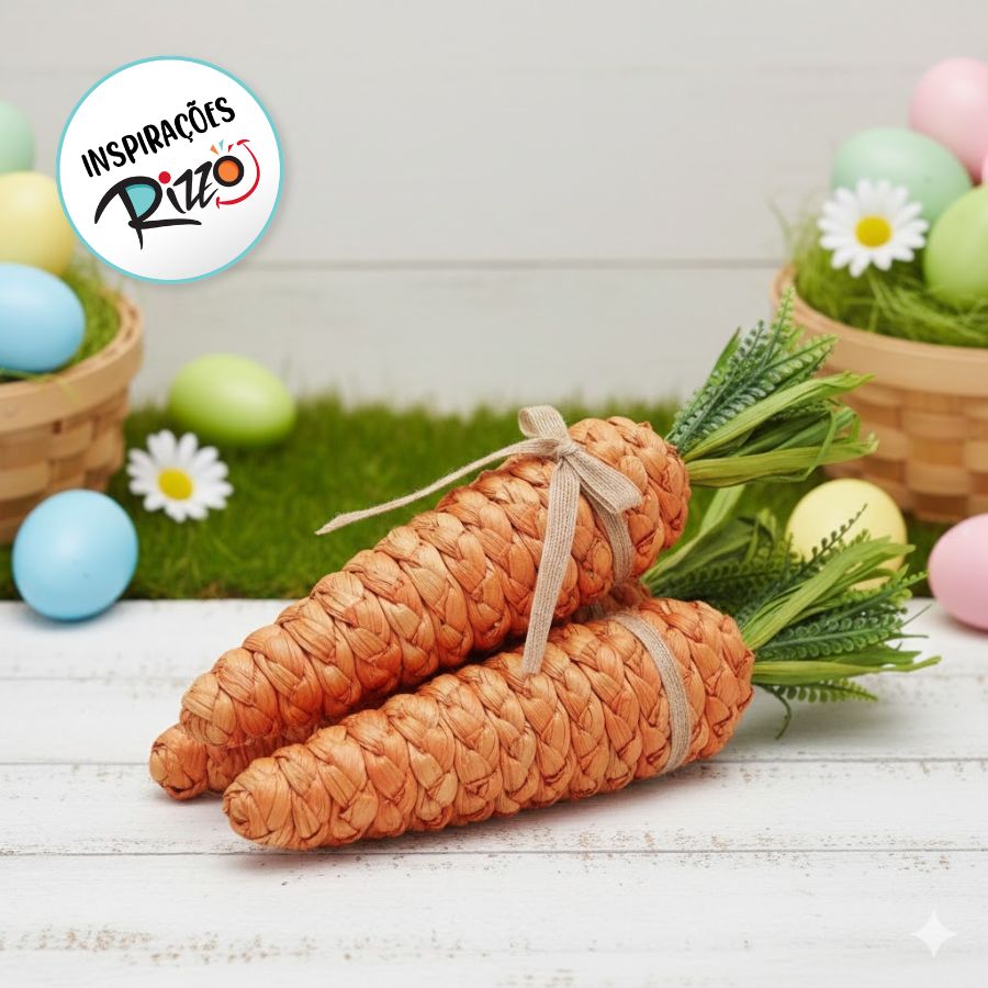 Com suas dimensões maiores, este maço se destaca como um elemento decorativo impactante. Pode ser utilizado como um destaque em cestas, como parte da decoração da mesa ou até mesmo como um enfeite marcante em outros espaços da casa. A combinação das cenouras com o laço de juta proporciona um toque rústico e festivo, ideal para celebrar a Páscoa com estilo. O "Maço com 3 Cenouras Decorativas" é uma escolha encantadora para trazer um toque especial e impressionante à sua celebração pascoal.