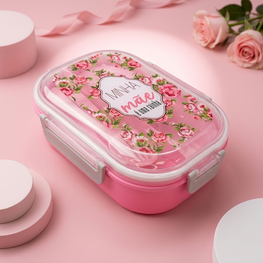 Marmita rosa com divisória de 3 partes, garfo e colher, com mensagem “Minha Mãe é uma Rainha”, ideal para transportar refeições com organização, praticidade e um toque especial de carinho.
