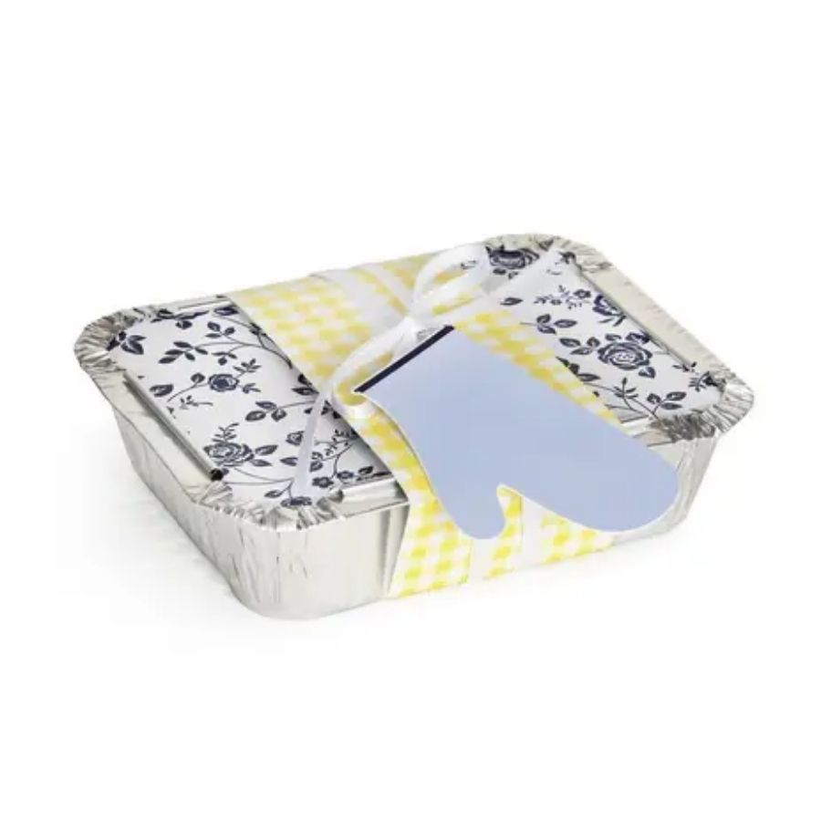 A Marmitinha M - Chá de Cozinha é ideal para lembrancinhas de festas e eventos temáticos. Ela possui estrutura de alumínio com tampa de papel cartão decorada com estampa floral preta sobre fundo branco. O grande diferencial desse modelo está nos acessórios que acompanham: tiras de papel com estampa amarela xadrez para envolver a tampa e uma delicada fita branca que pode ser usada para decorar ou fechar a marmitinha. Para dar o toque final, um mini charme em formato de luva de forno azul acompanha o conjunto, trazendo ainda mais charme e personalidade à apresentação.