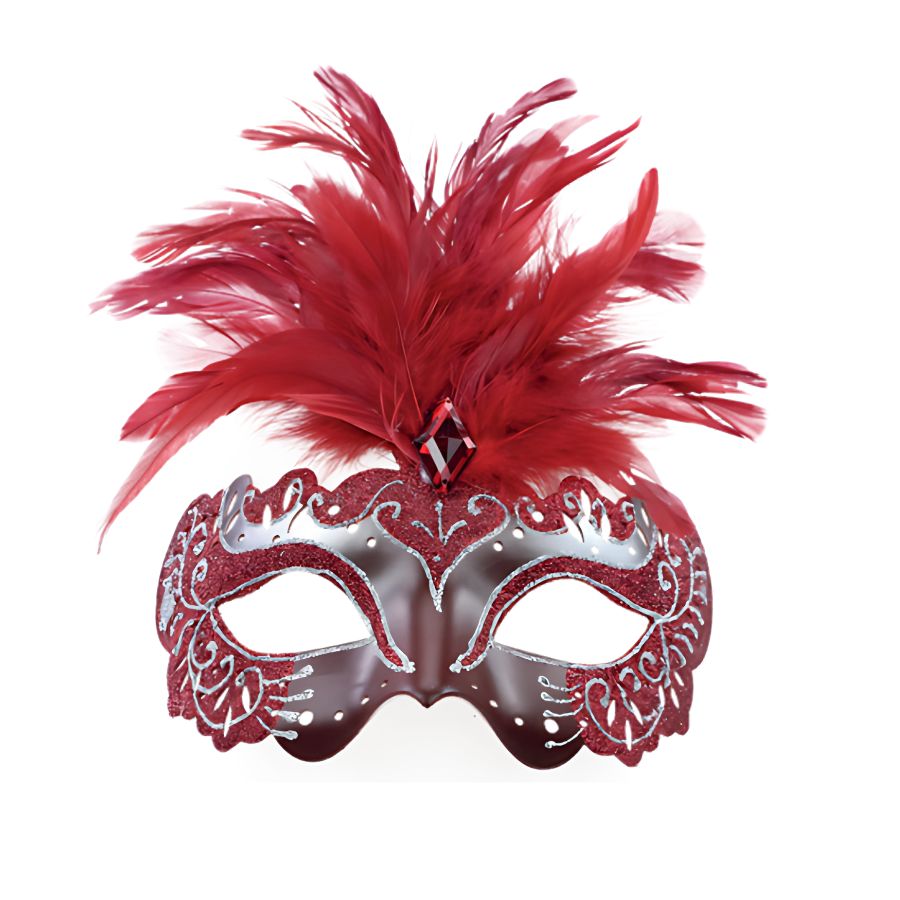 Máscara decorativa para Carnaval com plumas e glitter vermelho, trazendo estilo e destaque para fantasias e festas temáticas.