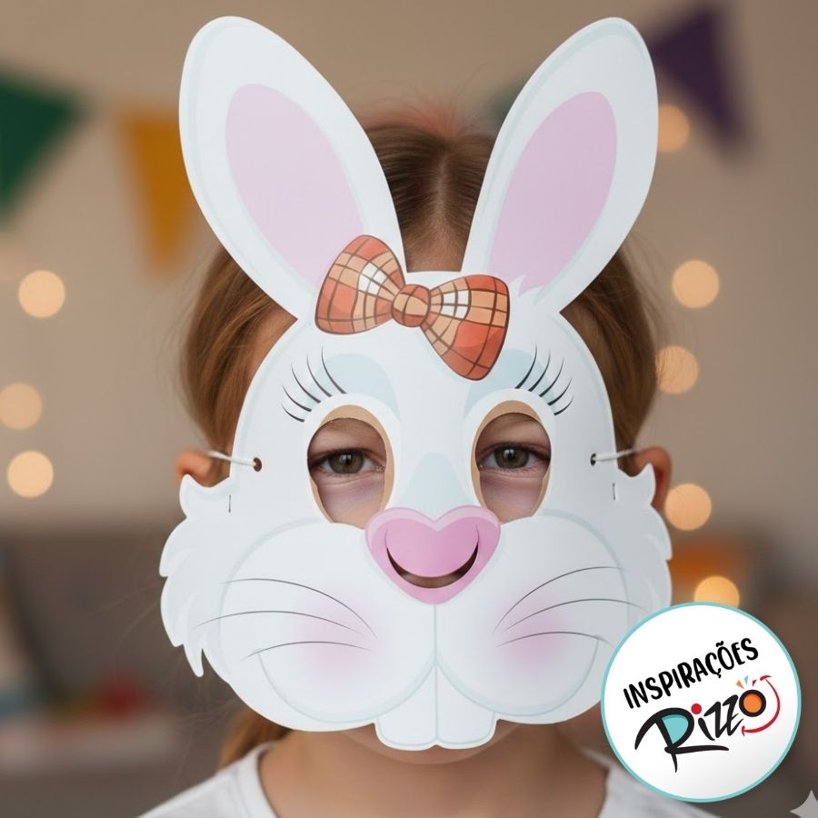 A máscara de coelha com laço possui dimensões aproximadas de 27x19cm e apresenta acabamento na cor rosa, com detalhe de laço que valoriza o visual. É indicada para uso em festas, eventos escolares, atividades recreativas e comemorações de Páscoa, sendo um acessório prático para complementar decorações e fantasias infantis.