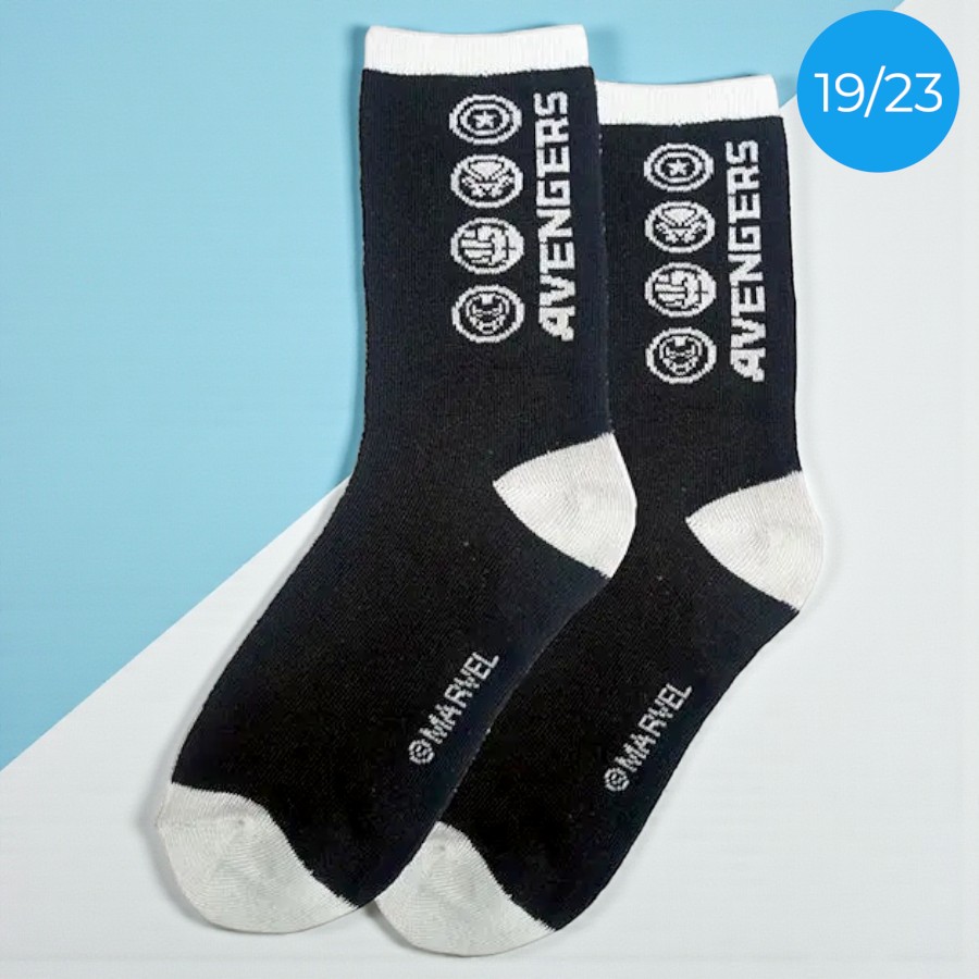 A Meia Infantil Cano Médio Vingadores traz um visual moderno em preto com detalhes em cinza claro, perfeita para quem adora o universo dos heróis Marvel Disney. Confortável e estilosa, acompanha a rotina dos pequenos em passeios, escola e momentos de diversão com um toque temático especial.