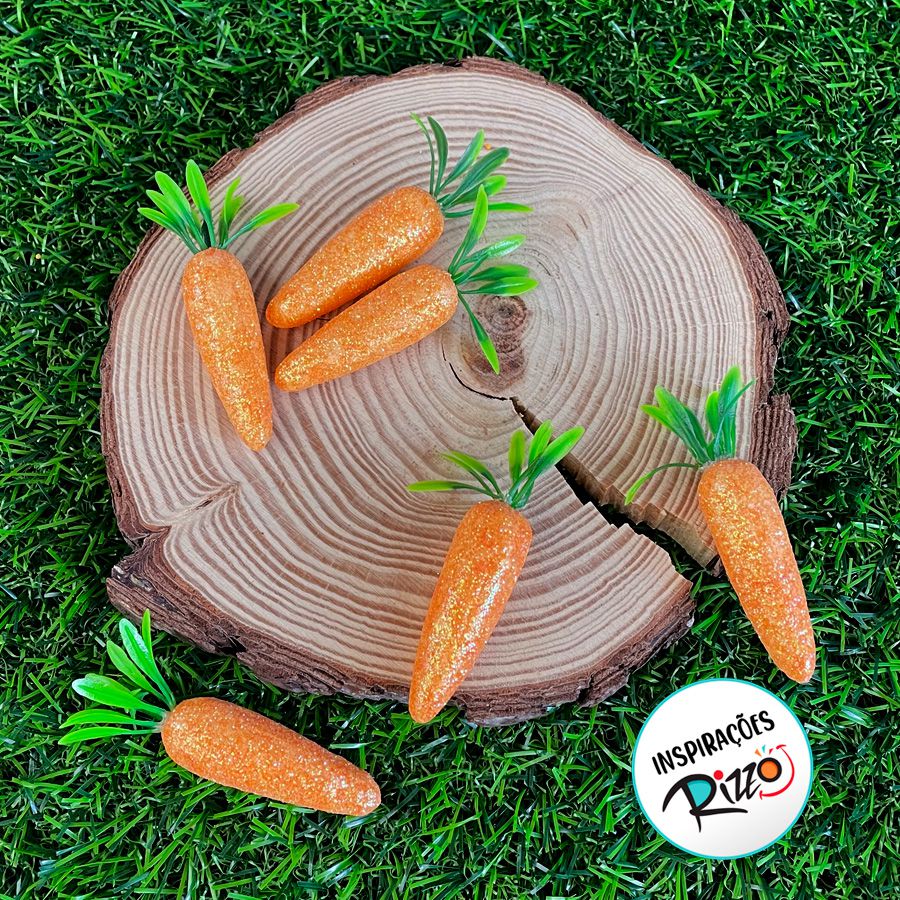 6 Mini Cenouras decorativas, feitas de isopor e folha feita de plástico, revestida com glitter