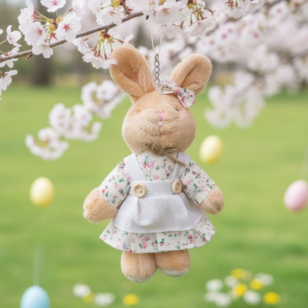 Delicada e cheia de charme, a mini coelha para pendurar é um item encantador para enriquecer a decoração de Páscoa. Em tom bege suave, ela veste um vestido florido fofo e romântico, trazendo um visual acolhedor que combina perfeitamente com propostas delicadas e afetivas.