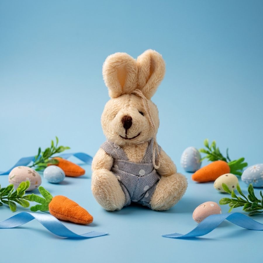 Mini coelho de pelúcia com roupa na cor azul poa