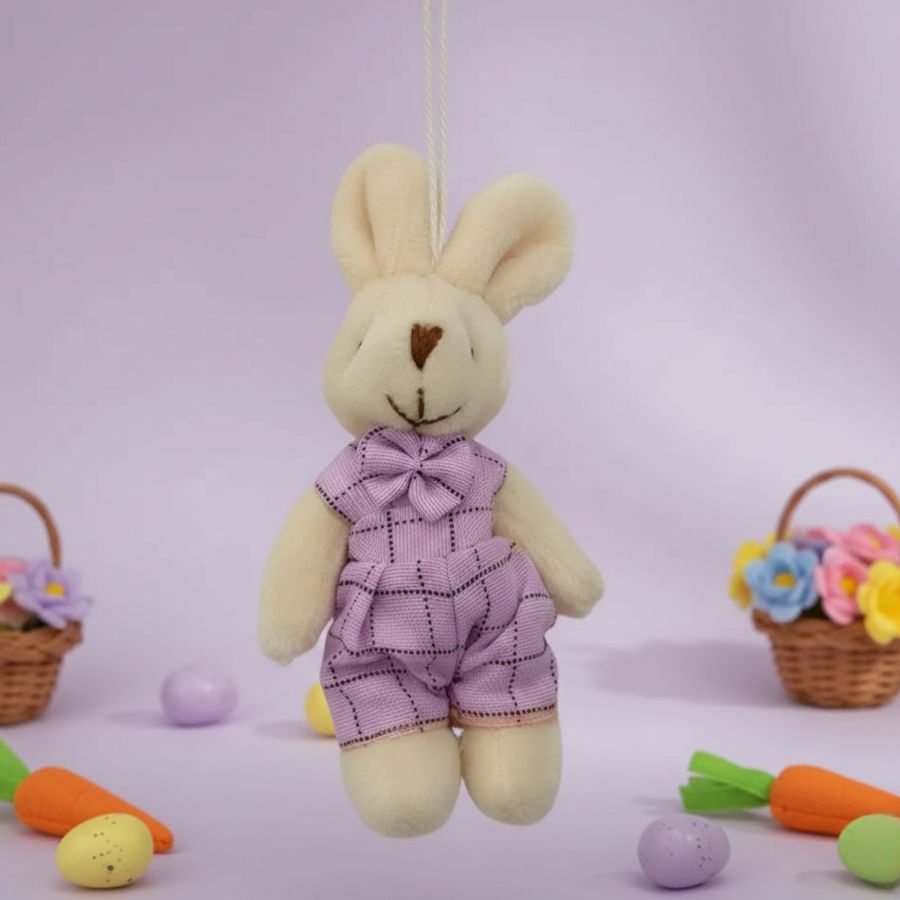 Mini coelho decorativo com macacão lilás xadrez, ideal para pendurar em árvores, guirlandas, galhos ou qualquer cantinho da sua casa que precise de um toque de charme e alegria nesta Páscoa.