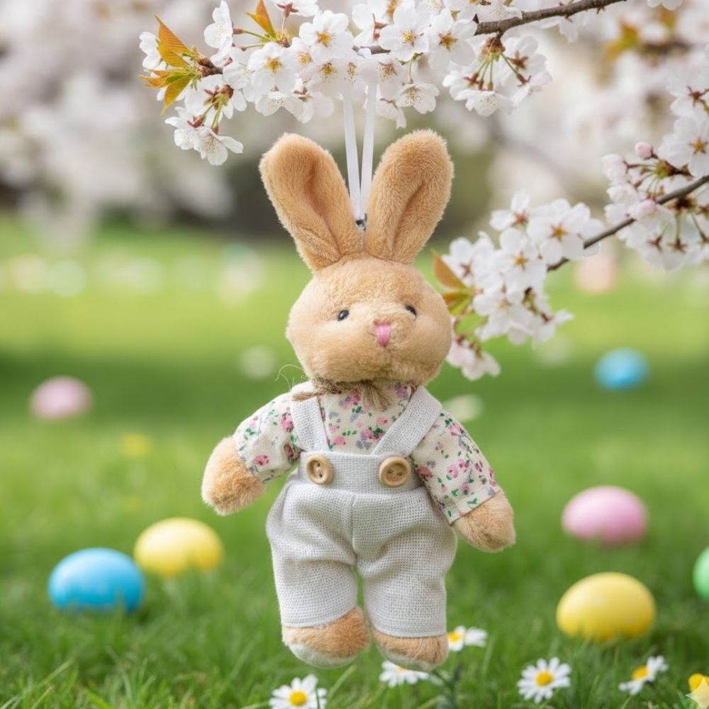 Encantador e delicado, o mini coelho para pendurar é perfeito para complementar a decoração de Páscoa com um toque suave e acolhedor. Em tom bege, ele veste uma charmosa jardineira florida, criando uma composição alegre e romântica que transmite leveza e carinho nos detalhes.