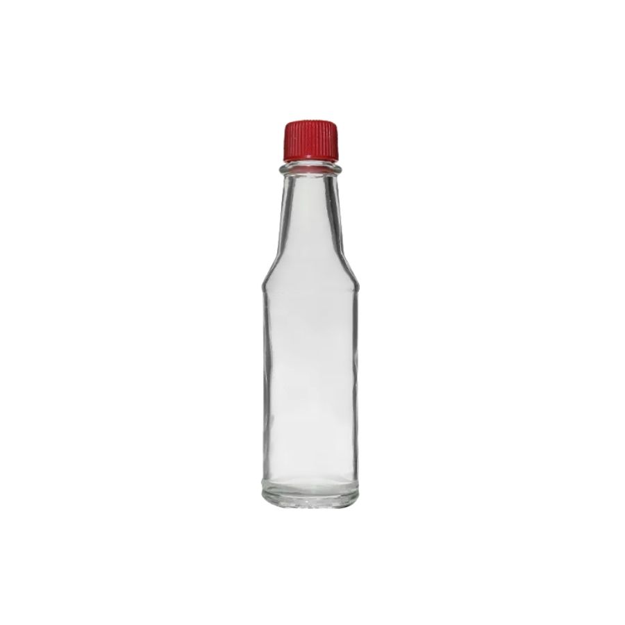 Mini frasco de vidro cilíndrico com tampa plástica vermelha rosqueável, 50ml, ideal para molhos, caldas, essências e kits personalizados com segurança e estilo.