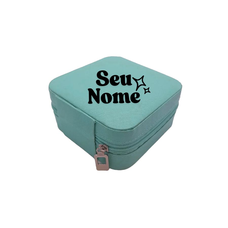 Mini porta-joias compacto e elegante, com nome personalizado em dourado e disponível em várias cores. Ideal para presentes e para quem busca praticidade com estilo.