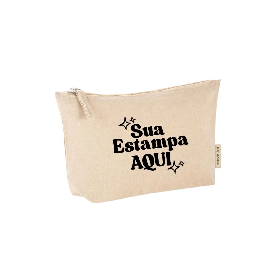 Necessaire de algodão reciclado personalizada 25x6x15cm, estampa de um lado com textura do tecido, variações na impressão possíveis, ideal para uso diário, brindes e presentes sustentáveis.