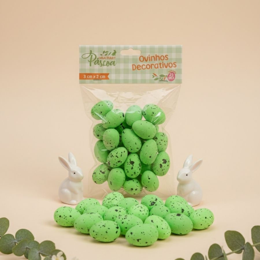 Ovinhos decorativos de Páscoa na cor verde com manchinhas, 3cm, ideais para composições decorativas e cenários temáticos.