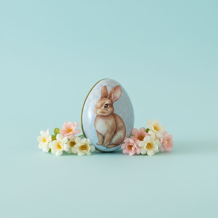 Ovo de metal de Páscoa azul com estampa Coelho Flores, tamanho 6,6x4,7x5,1 cm, ideal para lembrancinhas, embalagens decorativas e composições temáticas.