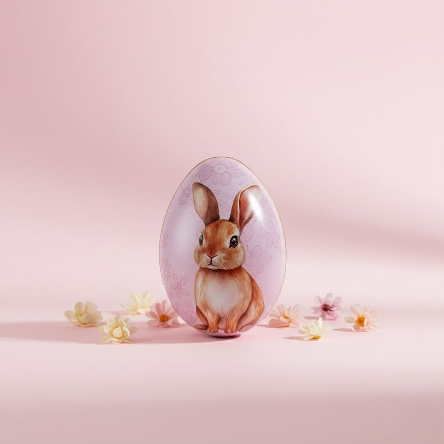 Ovo de metal de Páscoa rosa com estampa Coelho Flores, tamanho 6,6x4,7x5,1 cm, ideal para lembrancinhas, embalagens decorativas e composições temáticas.