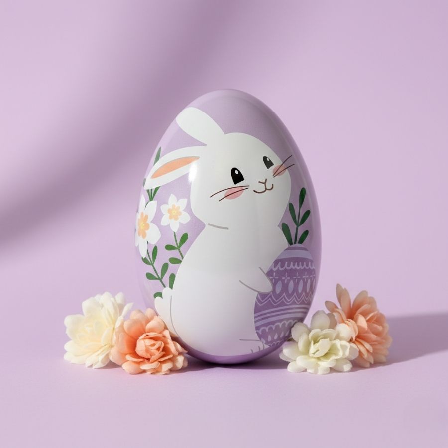 Ovo de metal de Páscoa roxo com estampa Jardim do Coelho, tamanho 12,7x8,4x9,1 cm, ideal para decoração, embalagens criativas e kits presenteáveis.