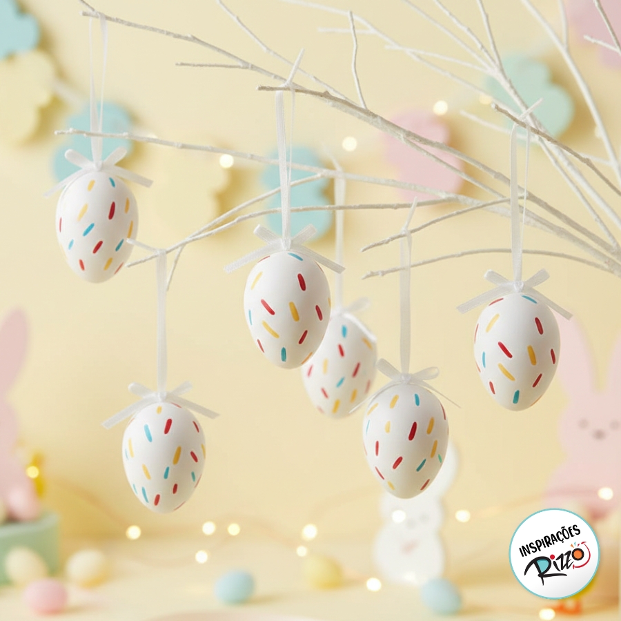 Os Ovos de Páscoa Branco com Respingos Coloridos para Pendurar são perfeitos para criar um ambiente festivo e cheio de charme.