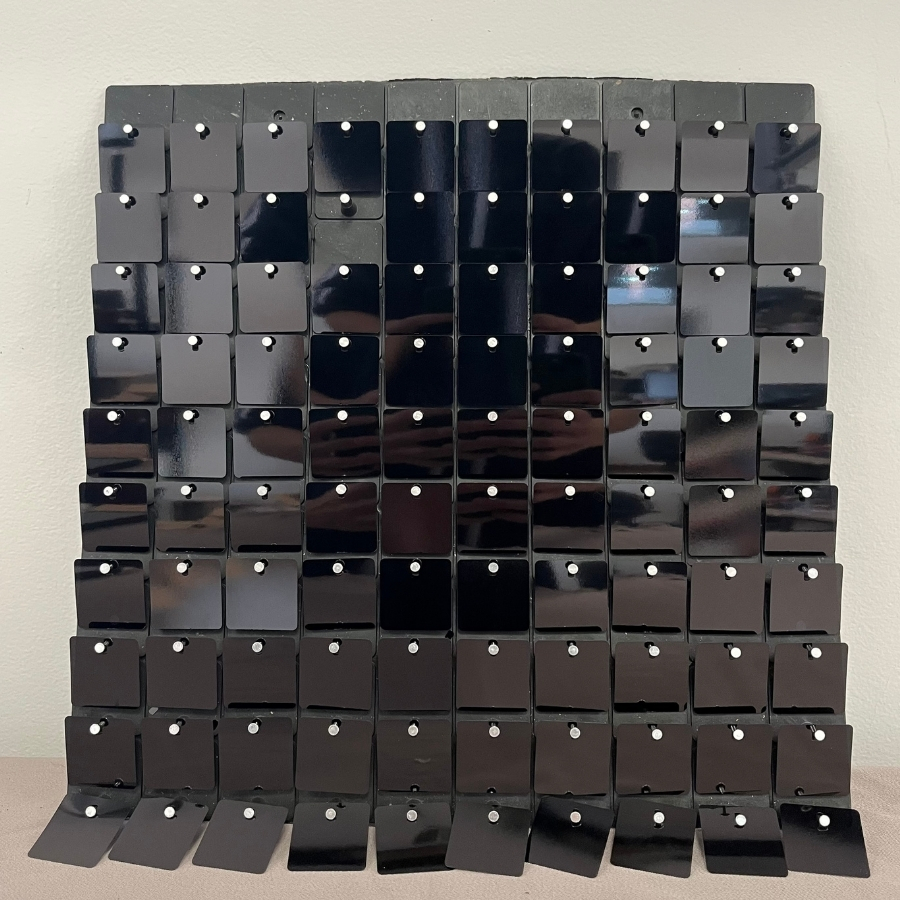 Painel decorativo preto com acabamento metalizado e efeito brilhante. Mede 30x30cm e é ideal para fundos fotográficos e eventos sofisticados.