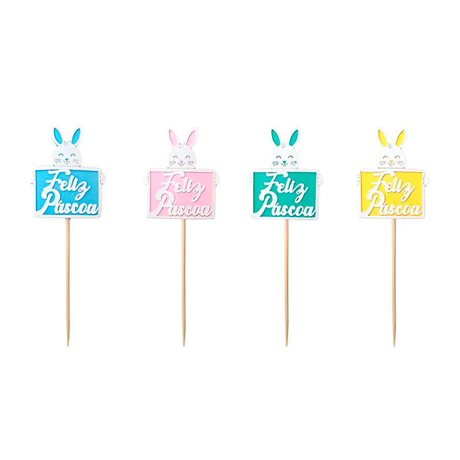 Palito decorativo feliz páscoa nas cores azul, rosa, amarelo e verde claro