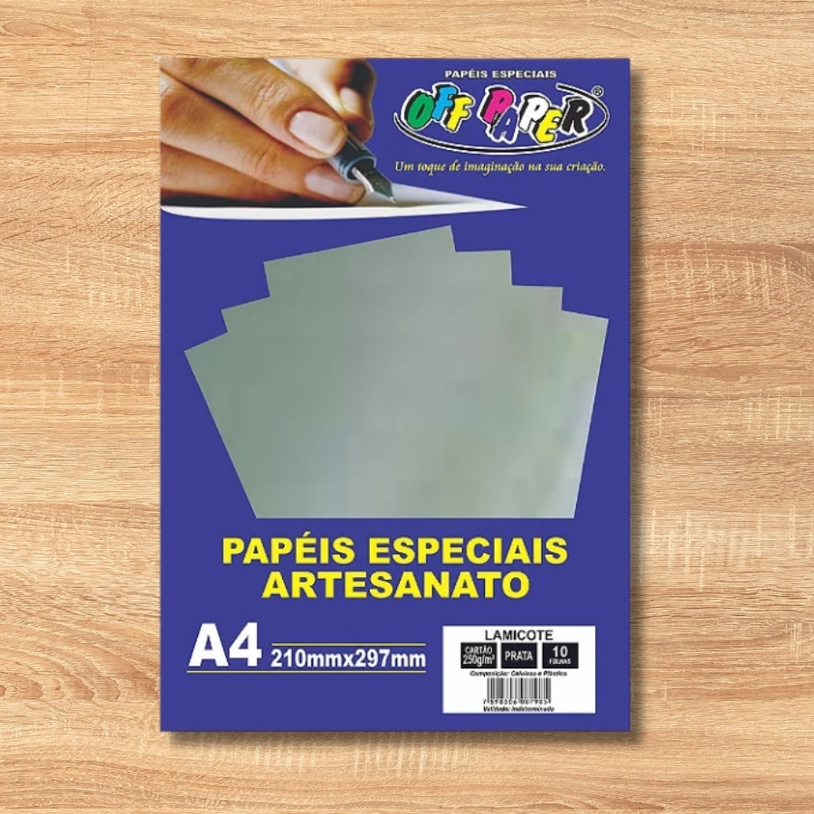 O Papel Lamicote Prata A4 250g possui acabamento metalizado e sofisticado, ideal para projetos gráficos, convites, embalagens e artesanato de alto impacto visual.
