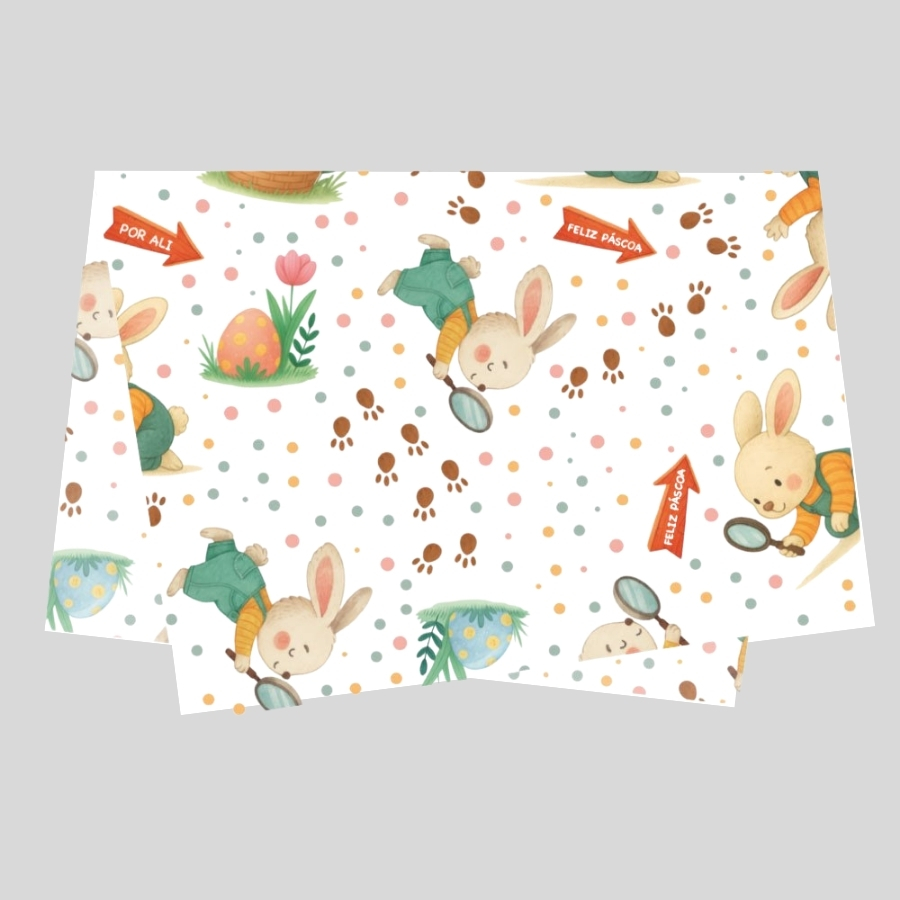 No formato 50x70cm, oferece excelente cobertura para embalar ovos de chocolate, forrar caixas e montar composições decorativas. Seu material leve e maleável facilita o manuseio, permitindo dobras e acabamentos personalizados. A estampa temática contribui para uma apresentação harmoniosa e alinhada às coleções especiais de Páscoa.