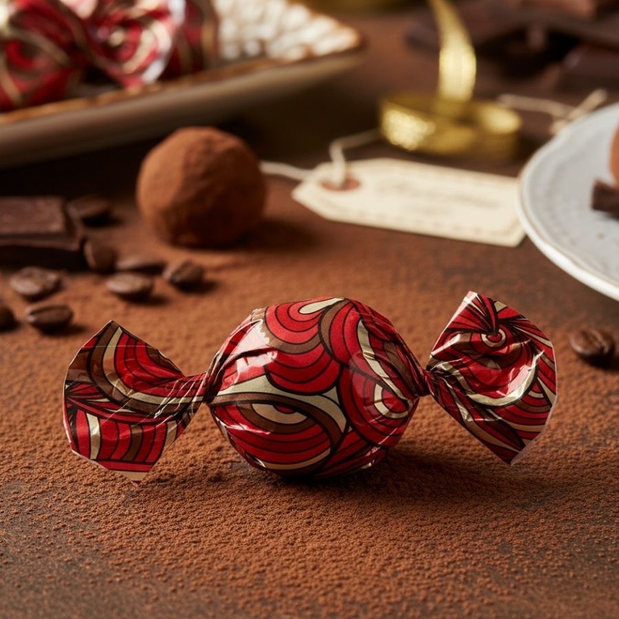 Papel para trufa vermelho com estampa Motion, ideal para embalar trufas, bombons e doces finos com elegância e destaque.