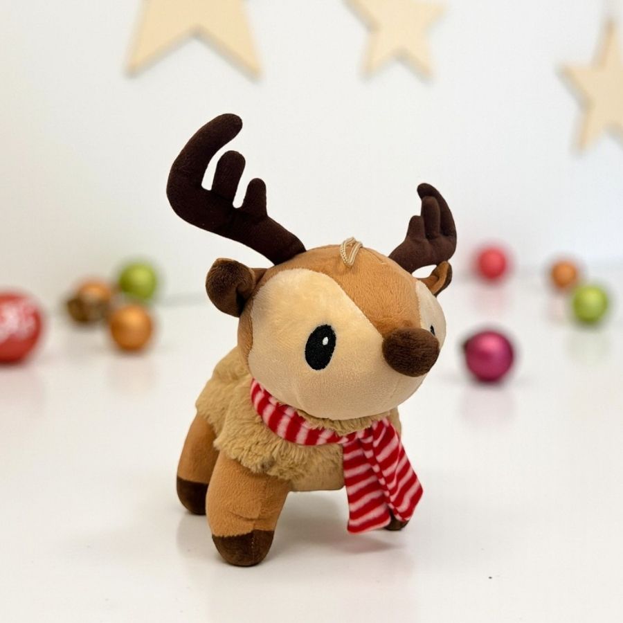 A Pelúcia de Natal Rena com cachecol listrado é macia, charmosa e alegre, perfeita para enfeitar ambientes natalinos com um toque moderno e acolhedor.