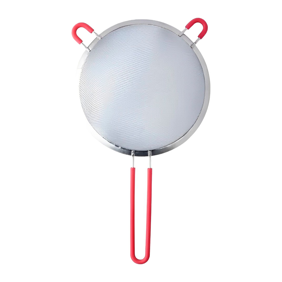 Peneira de inox com cabo e alças emborrachadas vermelhas