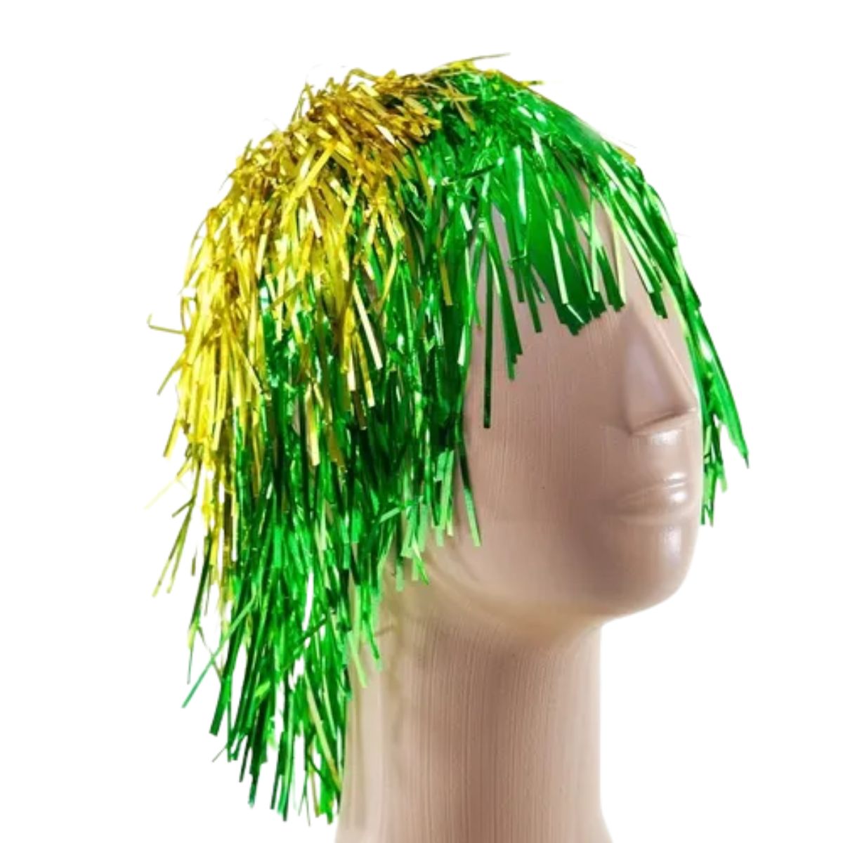 A Peruca Brasil em tinsel dourado e verde é o acessório perfeito para quem quer brilhar na torcida durante a Copa do Mundo. Produzida com fios de tinsel, ela cria um efeito cintilante e chamativo, refletindo a luz e garantindo destaque imediato. As cores dourado e verde remetem à energia da torcida brasileira, deixando o visual festivo, ousado e cheio de personalidade.