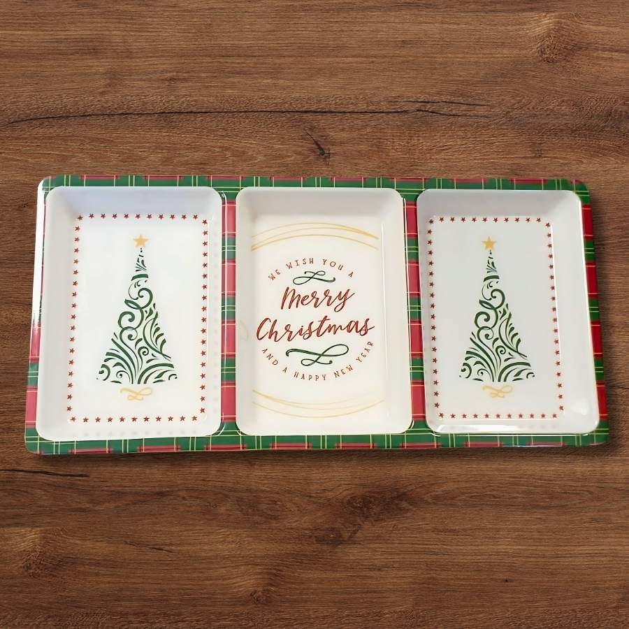 Petisqueira temática de Natal com estampa xadrez verde e vermelho. Conta com 3 divisões para organização de alimentos. Dimensões: 31x15,3x2,3cm. Ideal para servir aperitivos, petiscos, frutas e doces em festas e ceias natalinas.