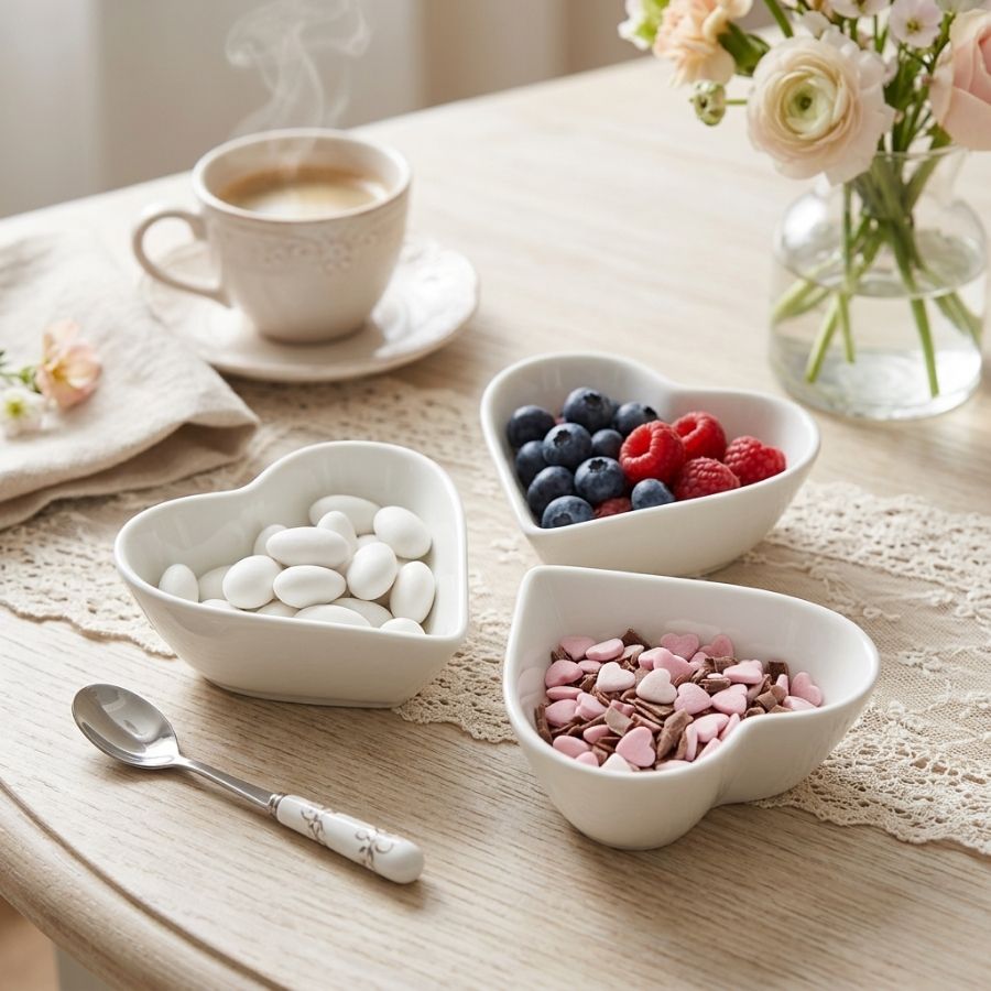 Cada embalagem contém 3 unidades, tornando o conjunto ideal para mesa posta, decoração de festas, eventos especiais e uso no dia a dia. O design em formato de coração traz um toque romântico e delicado, sendo uma ótima escolha para mesas de café, festas, chás, casamentos, datas comemorativas e decoração de Páscoa ou Dia dos Namorados. Compacta e charmosa, a petisqueira de resina branca ajuda a valorizar a apresentação de alimentos e a composição da mesa.